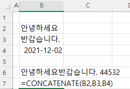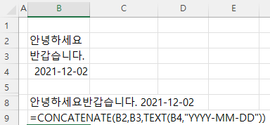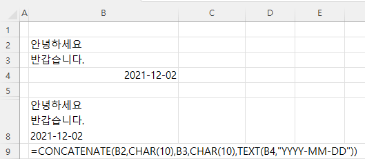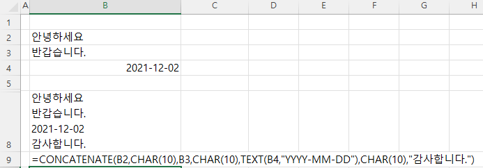 =CONCATENATE(B2,CHAR(10),B3,CHAR(10),TEXT(B4,"YYYY-MM-DD"),CHAR(10),"감사합니다.")