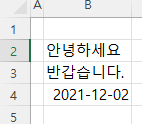 아래 예시처럼 B열에 안녕하세요, 반갑습니다., 2021-12-02의 날짜 데이터가 있고, 이걸 CONCATENATE 함수를 이용해서 한 셀에 합쳐볼게요.